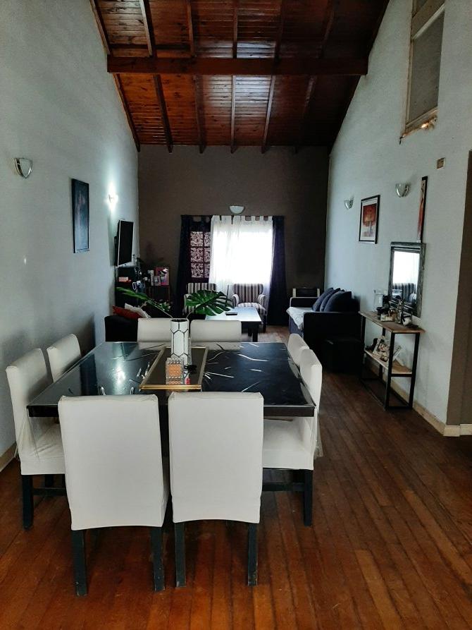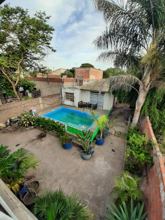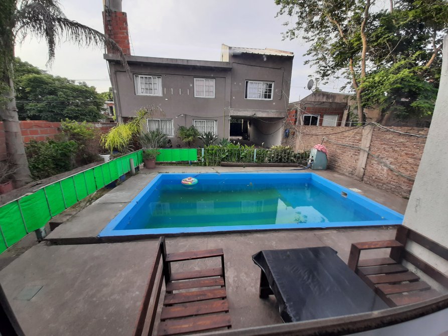 Patio: constituido con una cochera semicubierta para dos vehículos; piscina con cerca de seguridad y un quincho cubierto en la parte posterior del mismo, el cual cuenta con un amplio ambiente principal con aberturas vidriadas corredizas, cocina, lavadero, dos baños y una habitación.